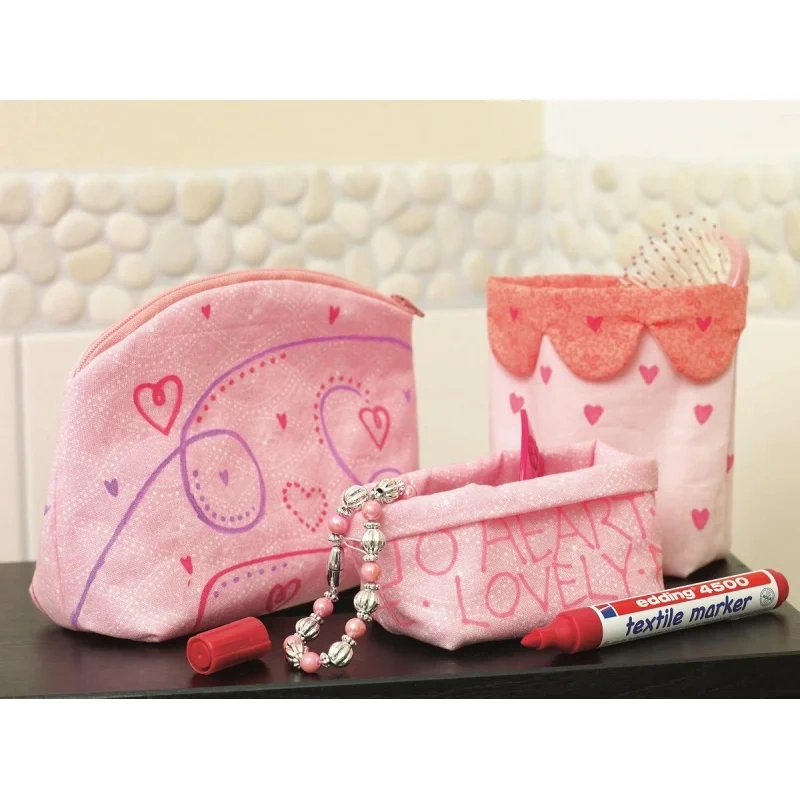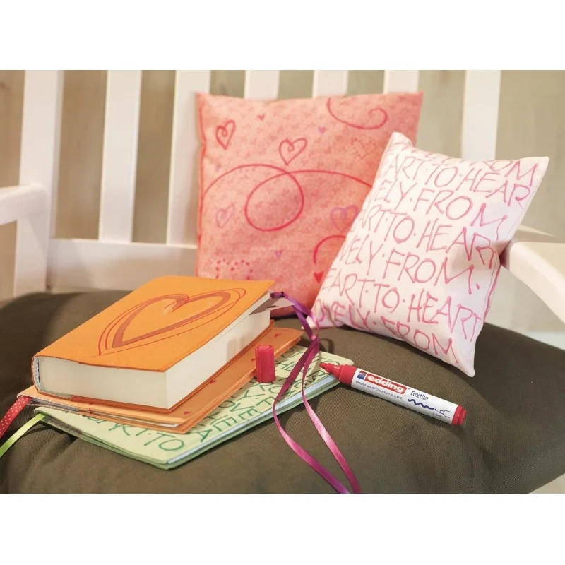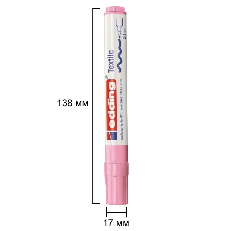 Маркер для текстиля Edding E-4500 CR предназначен для цветного оформления практически любых химически не обработанных тканей — хлопка, шелка, льна и т. д. Пигментные чернила розового цвета отличаются светостойкостью, быстро сохнут, практически не пахнут. Маркер по ткани имеет наконечник круглой формы, толщина линии — 2–3 мм. Для фиксации надпись или рисунок необходимо прогладить утюгом (без пара). После фиксации изделие можно стирать при температуре не выше 60 градусов Цельсия. На тёмных тканях надпись видна не будет.