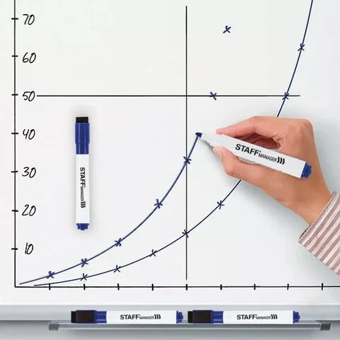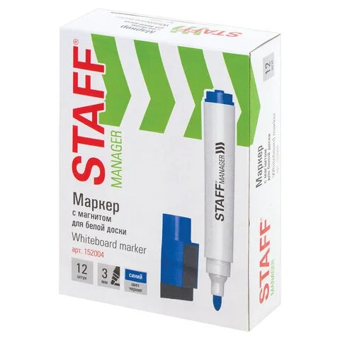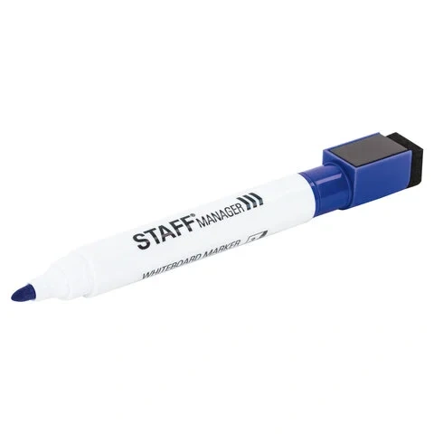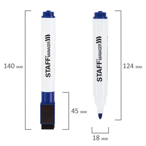 Маркер для доски синего цвета обладает круглым пластиковым корпусом диаметром 22 мм. Колпачок оснащен магнитом для крепления к любой металлической поверхности и губкой для быстрой корректировки текста во время написания. Наконечник круглой формы обеспечивает толщину линии письма 3 мм, что позволяет писать крупным шрифтом, который будет хорошо виден. Основа чернил - спиртовая. Чернила быстро высыхают и не оставляют разводов, легко стираются подушечкой, закрепленной на колпачке или специальным стирателем для магнитно-маркерных досок. Изделие не перезаправляется. Цвет колпачка соответствует цвету чернил.