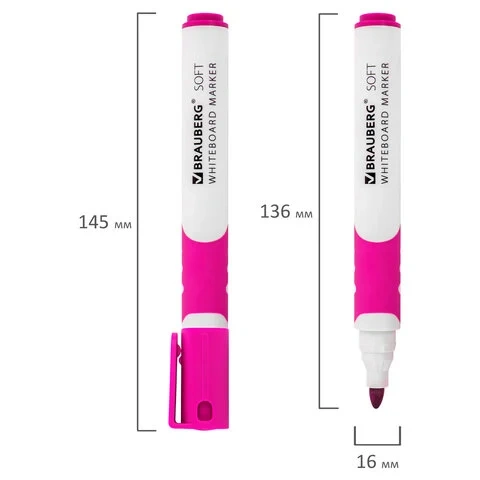 Маркер для доски розового цвета обладает круглым пластиковым корпусом диаметром 16 мм. Корпус оснащен удобной прорезиненной зоной захвата для более удобного использования. Наконечник круглой формы обеспечивает толщину линии письма 5 мм, что позволяет писать крупным шрифтом, который будет хорошо виден. Основа чернил - спиртовая. Чернила быстро высыхают и не оставляют разводов, легко стираются сухой губкой. Изделие не перезаправляется. Цвет колпачка и прорезиненной вставки соответствует цвету чернил.
