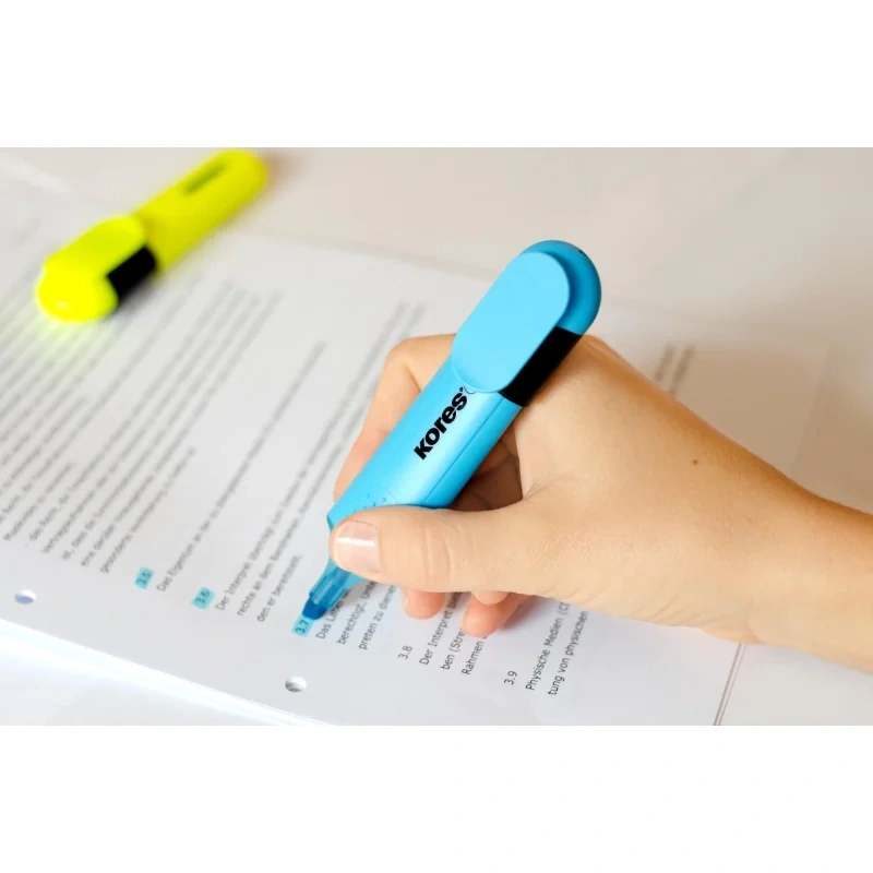 Текстовыделитель Kores со скошенным наконечником. Предназначен для выделения текста на различных типах бумаги. Позволяет проводить линии толщиной от 0.5 до 5 мм. Чернила на водной основе обладают высокой светостойкостью. Удобный пластиковый корпус. Хранить в сухом, защищенном от попадания прямых солнечных лучей месте.