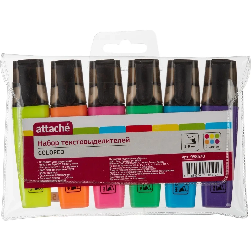 Набор текстовыделителей Attache Colored — это отличный выбор для любителей рисования маркерами. Текстовыделитель поможет выделять самое важное в документах или просто тексте, и Вы сможете обработать и не забыть больше полезной информации. В наборе 6 цветов: желтый, зеленый, оранжевый, розовый, голубой, фиолетовый. Текстовыделитель обладает экономным расходом чернил. Светоустойчивые чернила на водной основе не выцветают даже на открытом солнце и не размазываются в процессе. Чернила не промокают бумагу. Цвет корпуса соответствует цвету чернил. Чернила не имеют запах. Маркер обладает плоской формой корпуса. Скошенный наконечник имеет толщину линии письма от 1 до 5 мм, что обеспечивает удобство при работе с текстом, напечатанным мелким шрифтом, или таблицами.