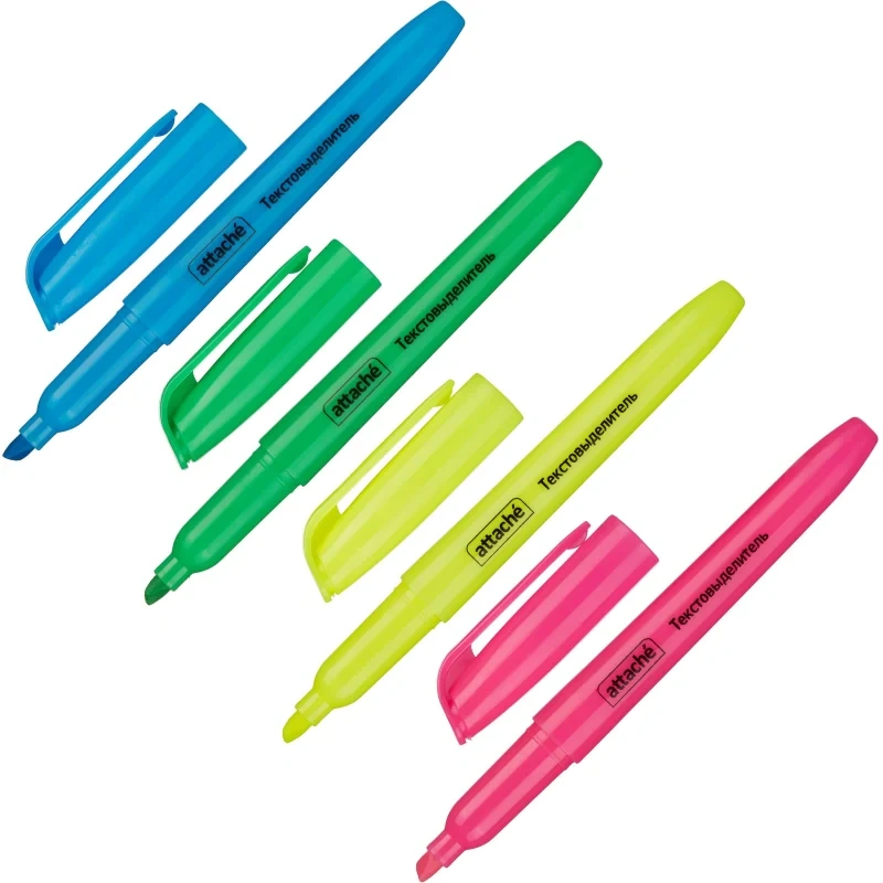 Набор текстовыделителей Attache — это отличный выбор для любителей рисования маркерами. Текстовыделитель поможет выделять самое важное в документах или просто тексте, и Вы сможете обработать и не забыть больше полезной информации. Текстовыделитель обладает экономным расходом чернил. Светоустойчивые чернила на водной основе не выцветают даже на открытом солнце и не размазываются в процессе. Чернила не промокают бумагу. В наборе 4 цвета: розовый, жёлтый, зелёный, голубой. Цвет корпуса соответствует цвету чернил. Чернила не имеют запах. Скошенный наконечник имеет толщину линии письма от 1 до 4 мм, что обеспечивает удобство при работе с текстом, напечатанным мелким шрифтом, или таблицами.