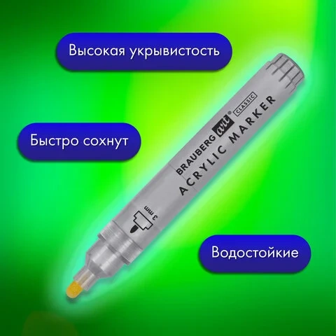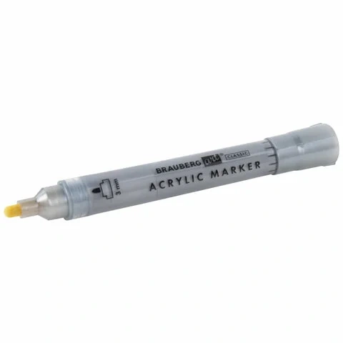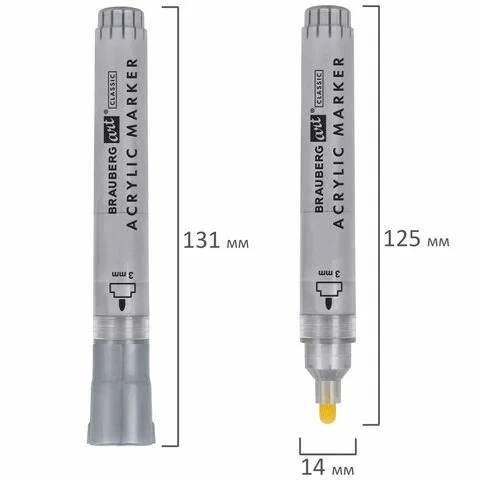Акриловые маркеры с круглой формой корпуса из пластика. В комплекте 2 цвета. Толщина линии письма – 3 мм. Объем краски – 10 мл. Пигментированная акриловая краска на водной основе практически не имеет запаха, после высыхания обладает повышенной светостойкостью и водостойкостью.
