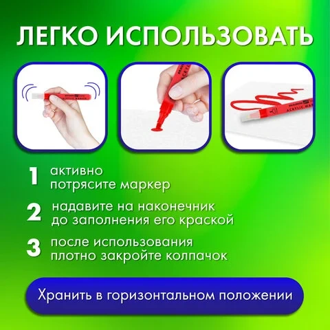Надежный помповый механизм подачи краски предотвращает вытекание и разбрызгивание в процессе использования, а также преждевременное высыхание. Износостойкий фетровый наконечник устойчив к повреждениям и обеспечивает экономный расход чернил. Изделие не перезаправляется. Плотно закрывается колпачком, что предотвращает высыхание наконечника и чернил.