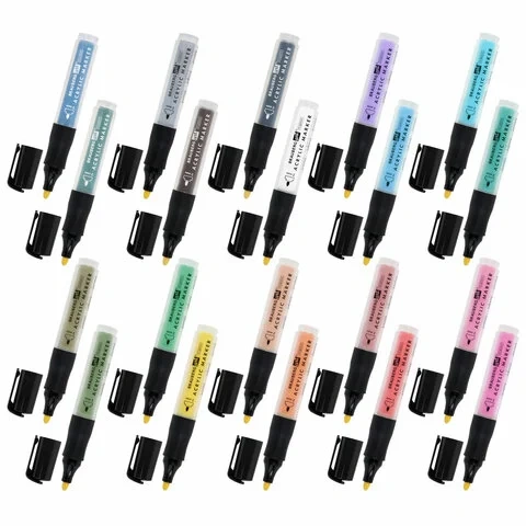 Набор акриловых маркеров с круглой формой корпуса из пластика и удобной прорезиненной ручкой, удобной для письма и рисования. 20 ярких цветов. Форма наконечника – круглая. Толщина линии письма – 2 мм. Объём краски – 3,5 мл. Пигментированная акриловая краска на водной основе практически не имеет запаха, после высыхания обладает повышенной светостойкостью и водостойкостью. Краска обладает превосходной укрывистостью. Благодаря водной основе краска быстро сохнет и не размазывается.