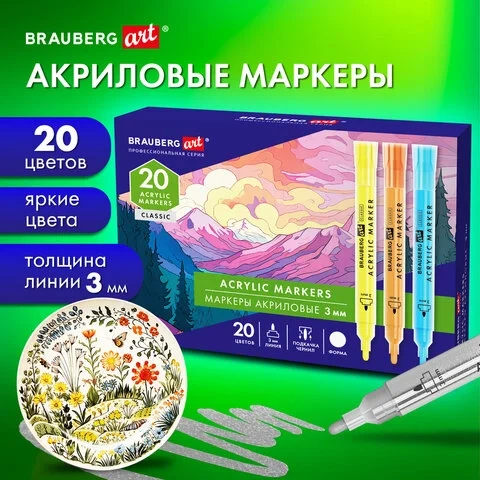 Маркеры акриловые для рисования и хобби, 20 ярких цветов, линия 3 мм, BRAUBERG ART CLASSIC, 152526