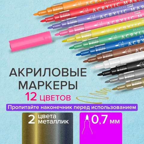 Маркеры акриловые для рисования и хобби BRAUBERG ART CLASSIC, НАБОР 12 цветов, наконечник 0,7 мм, 15