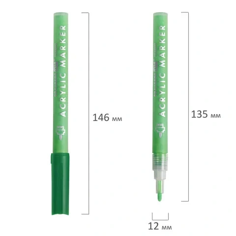 12 цветов в наборе: золотой, серебряный, черный, белый, зеленый, оранжевый, дубовый, алый, желтый, синий, фиолетовый, розовый. Круглый пластиковый корпус, внутри которого находится металлический цилиндр для взбалтывания краски, имеет диаметр 12 мм. Пигментированная акриловая краска на водной основе практически не имеет запаха, после высыхания обладает повышенной светостойкостью и водостойкостью. Краска обладает превосходной укрывистостью. Благодаря водной основе краска быстро сохнет и не размазывается. Надежный помповый механизм подачи краски предотвращает вытекание и разбрызгивание в процессе использования, а также преждевременное высыхание. С помощью круглого прочного наконечника, выполненного из пористого акрила с шириной линии письма 1 мм, можно легко наносить тонкие линии. Цвет корпуса и колпачка соответствует цвету краски.