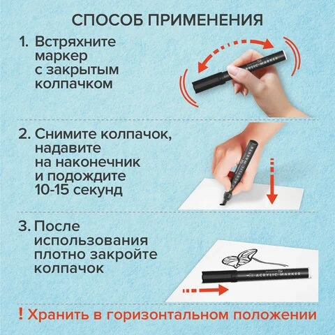 2 цвета в наборе: черный и белый. Круглый пластиковый корпус, внутри которого находится металлический цилиндр для взбалтывания краски, имеет диаметр 18 мм. Пигментированная акриловая краска на водной основе практически не имеет запаха, после высыхания обладает повышенной светостойкостью и водостойкостью. Краска обладает превосходной укрывистостью. Благодаря водной основе краска быстро сохнет и не размазывается. Надежный помповый механизм подачи краски предотвращает вытекание и разбрызгивание в процессе использования, а также преждевременное высыхание. С помощью круглого прочного наконечника, выполненного из пористого акрила с шириной линии письма 2 мм, можно легко наносить линии средней толщины. Цвет корпуса и колпачка соответствует цвету краски.