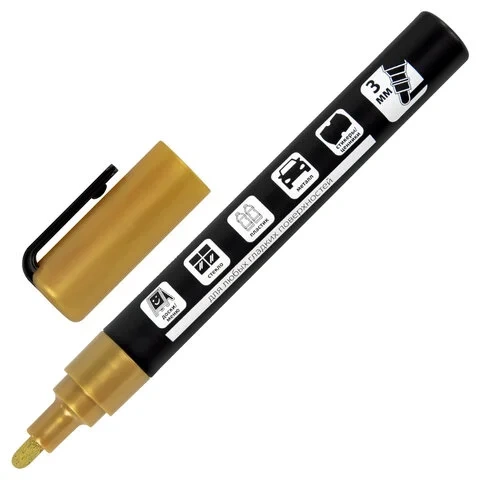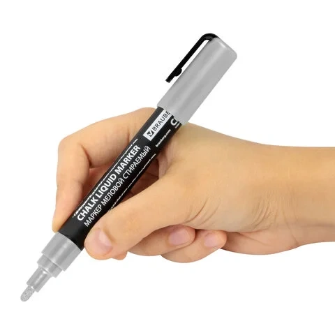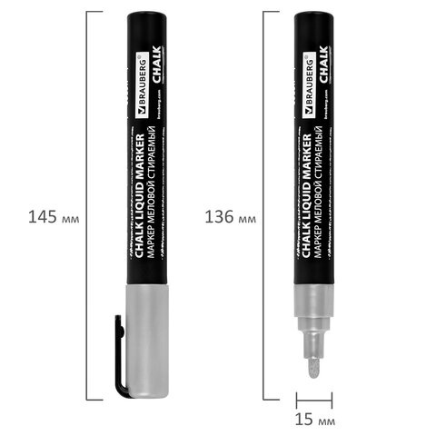 В наборе 8 меловых маркеров с цветами металлик: золотистый, серебристый, бронзовый, лавандовый, красный, темно-зеленый, розовый, синий. Рисунок получается плотный и яркий. Чернила на водно-меловой основе без резкого запаха. Толщина линии письма – от 1 мм до 3 мм, зависит от угла наклона мелового маркера. Круглый корпус выполнен из пластика.