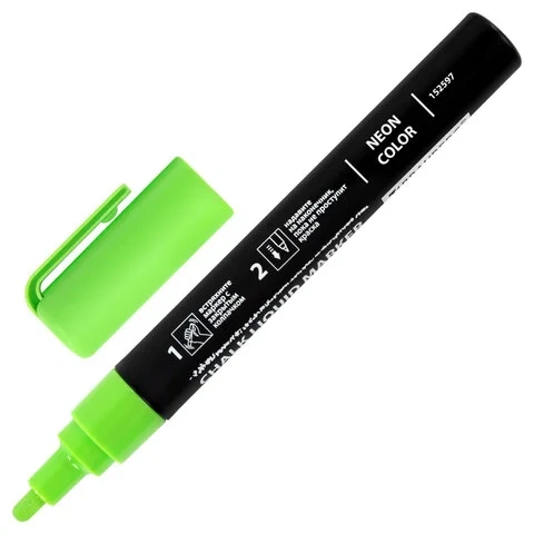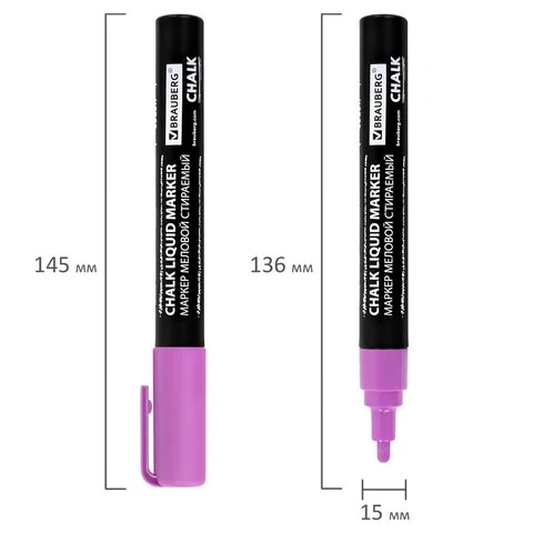 В наборе 8 меловых маркеров неоновых цветов: оранжевый, фиолетовый, красный, синий, розовый, зеленый, белый и желтый. Рисунок получается плотный и яркий. Чернила на водно-меловой основе без резкого запаха. Толщина линии письма – от 1 мм до 3 мм, зависит от угла наклона мелового маркера. Круглый корпус выполнен из пластика.
