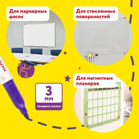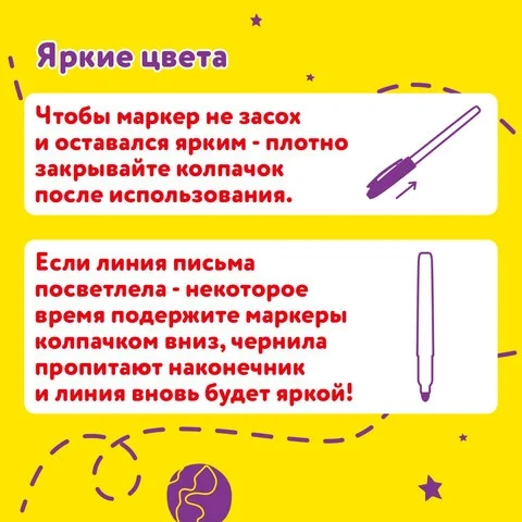10 цветов в наборе: черный, красный, синий, коричневый, светло-зеленый, розовый, оранжевый, фиолетовый, светло-голубой, желтый. Круглый пластиковый корпус с ярким дизайном имеет диаметр 15 мм. Наконечник круглой формы обеспечивает толщину линии письма 3 мм, что позволяет писать крупным шрифтом, который будет хорошо виден. Основа чернил - спиртовая. Чернила быстро высыхают и легко стираются сухой губкой, не оставляя разводов. Изделие не перезаправляется. Цвет колпачка и клипа соответствует цвету чернил.