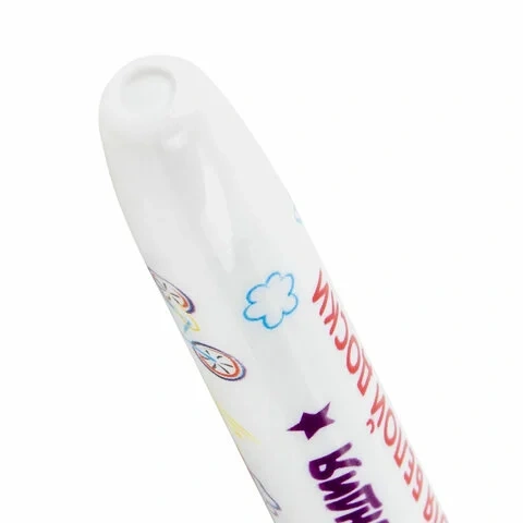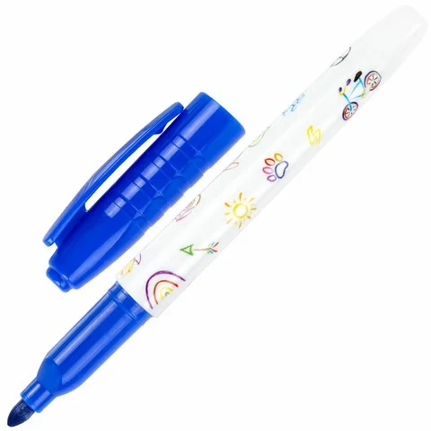 5 цветов в наборе: черный, красный, синий, зеленый, желтый. Круглый пластиковый корпус с ярким дизайном имеет диаметр 15 мм. Наконечник круглой формы обеспечивает толщину линии письма 3 мм, что позволяет писать крупным шрифтом, который будет хорошо виден. Основа чернил - спиртовая. Чернила быстро высыхают и легко стираются сухой губкой, не оставляя разводов. Изделие не перезаправляется. Цвет колпачка и клипа соответствует цвету чернил.