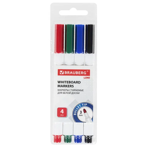 Маркер для досок Brauberg Line набор 4 цвета, 3 мм, с клипом, 152119
