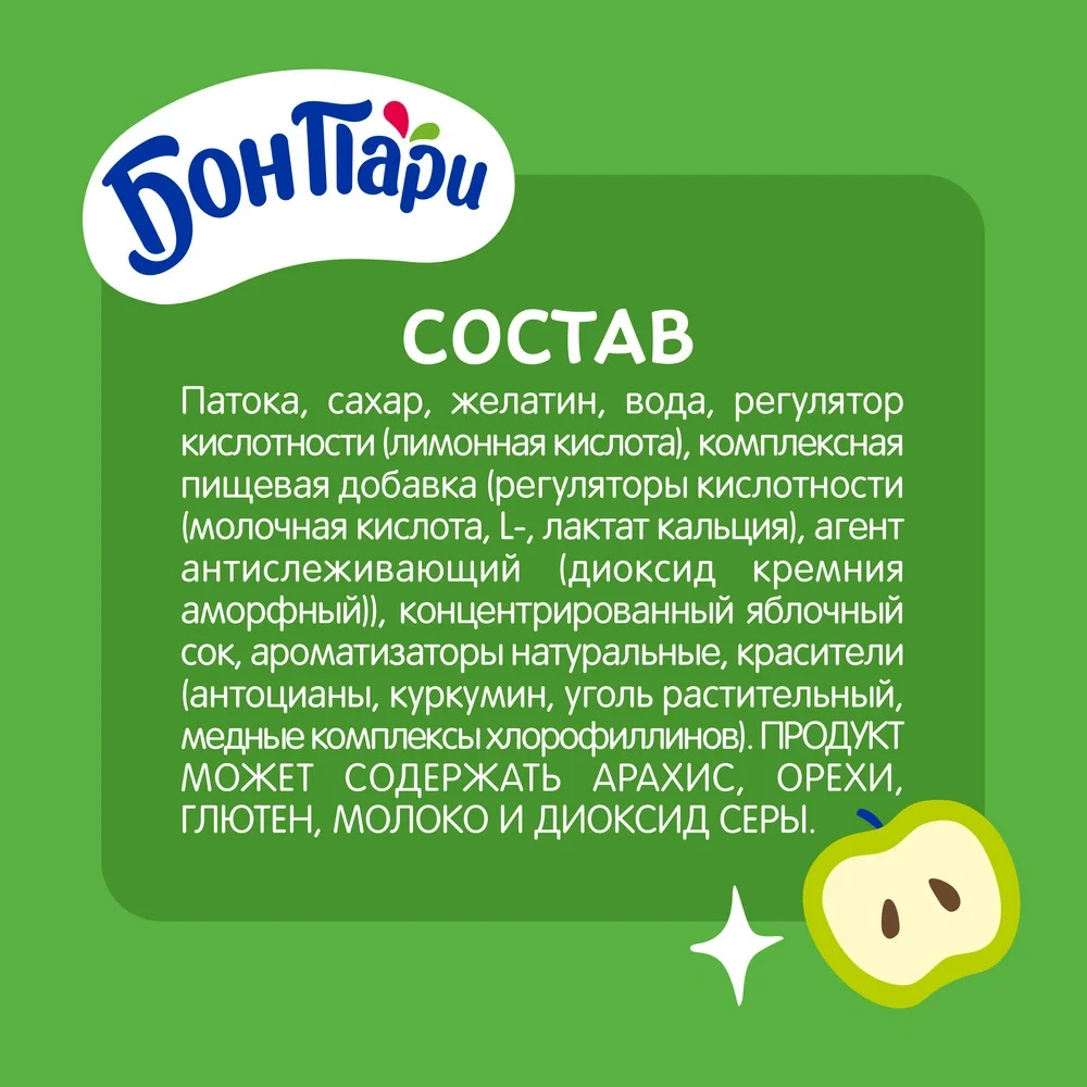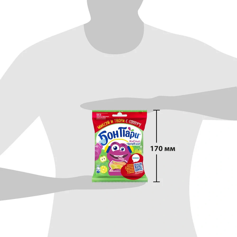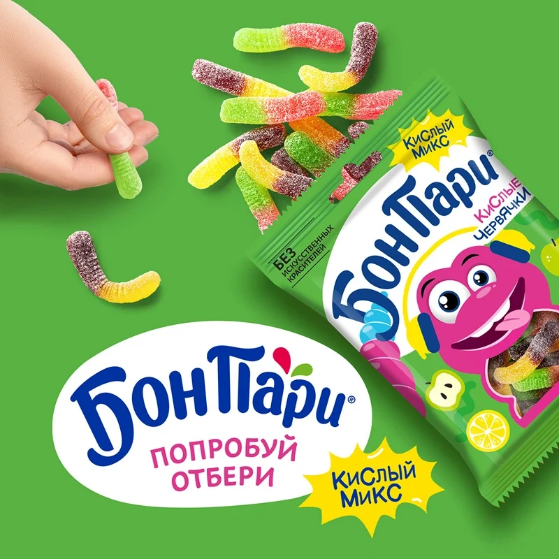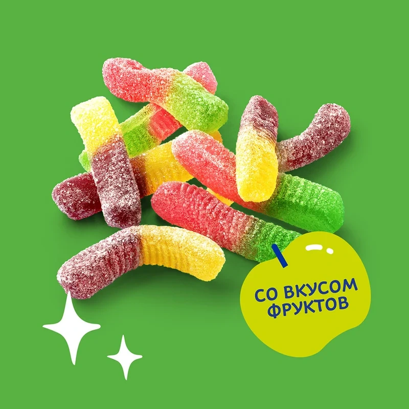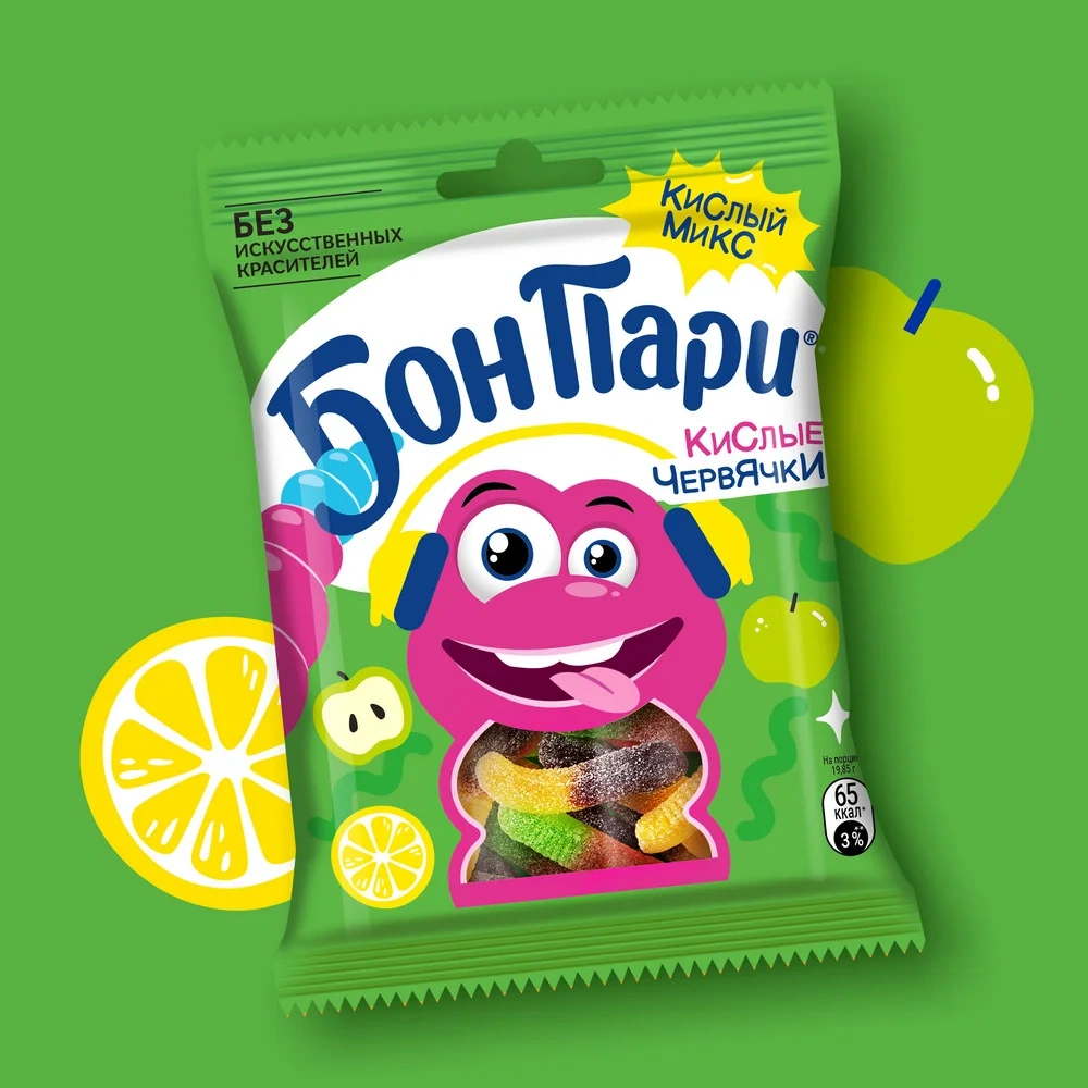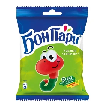 Кислый жевательный мармелад со вкусом фруктов в сахарной обсыпке - яблоко/малина и лимон/черная смородина в форме забавных червячков от бренда номер 1. Необычное сочетание кислого и сладких вкусов. Без искусственных красителей. Прошло более 40 лет, с момента появления первой конфеты Бон Пари, но до сих пор восхитительный вкус продолжает привлекать новых покупателей и приносить радость в повседневную жизнь.