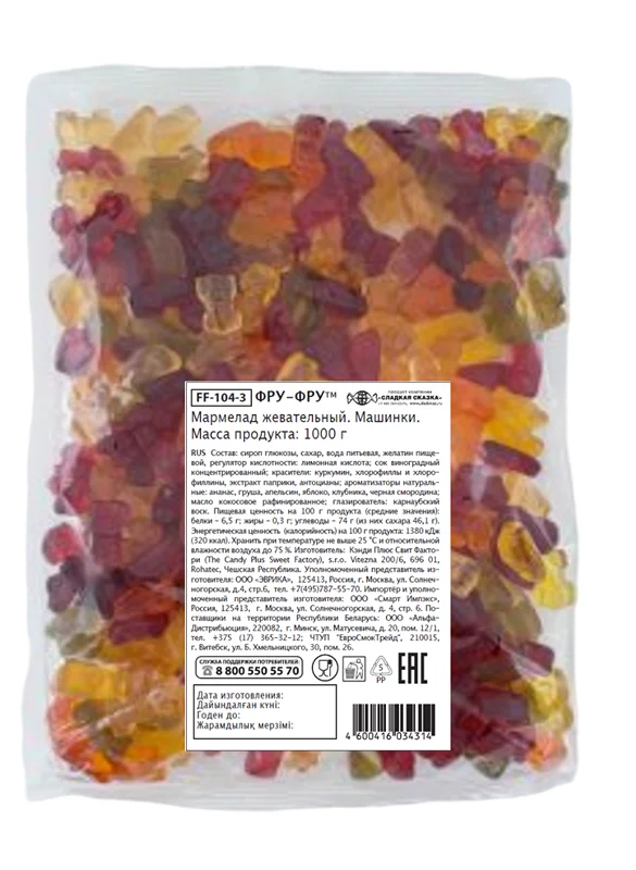 С радостью представляем вам жевательный мармелад Фру-Фру, который можно приобрести в пакетах весом 1кг. Теперь вы можете надолго запастись жевательным мармеладом и попробовать его виды и в любом количестве. Жевательный мармелад Фру-Фру Машинки приведёт в восторг любого мальчишку. Выполненный в форме разноцветных гоночных автомобилей, мармелад обладает вкусом фруктов и производится в Чехии. Мармелад отлично подойдёт в качестве лакомства для детей и взрослых - это угощение, которое нравится и девочкам, и мальчикам, их папам и мамам, друзьям и учителям.
