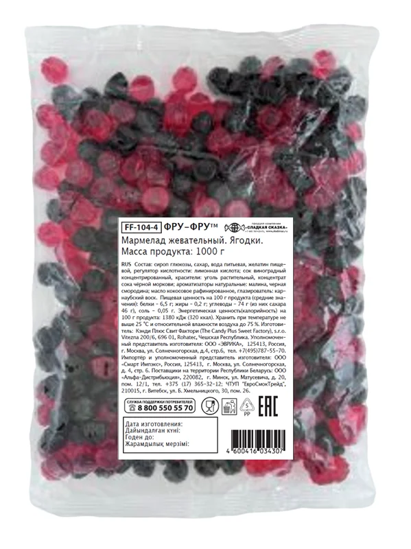 С радостью представляем вам жевательный мармелад Фру-Фру, который можно приобрести в пакетах весом 1кг. Теперь вы можете надолго запастись жевательным мармеладом и попробовать его виды и в любом количестве. Ягодки - мармеладное ассорти из разноцветных ягод. Жевательный мармелад гармонично вписывается в здоровый рацион питания за счет высокого содержания полезных веществ и отсутствия жиров: желатин улучшает состояние кожи и волос. Лимонная кислота - натуральный антиоксидант, улучшает обмен веществ.
