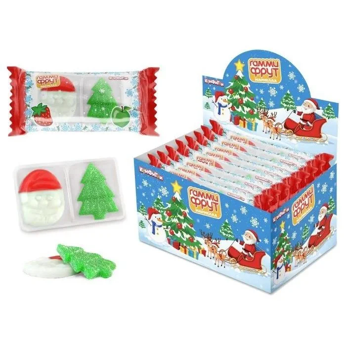 Недорогой новогодний сувенир из жевательного мармелада. На пластиковой подложке две фигурных мармеладки: дед мороз со вкусом клубники и ёлочка со вкусом яблока. Упаковка снабжена прозрачным окном, через которое хорош видно качество мармелада.