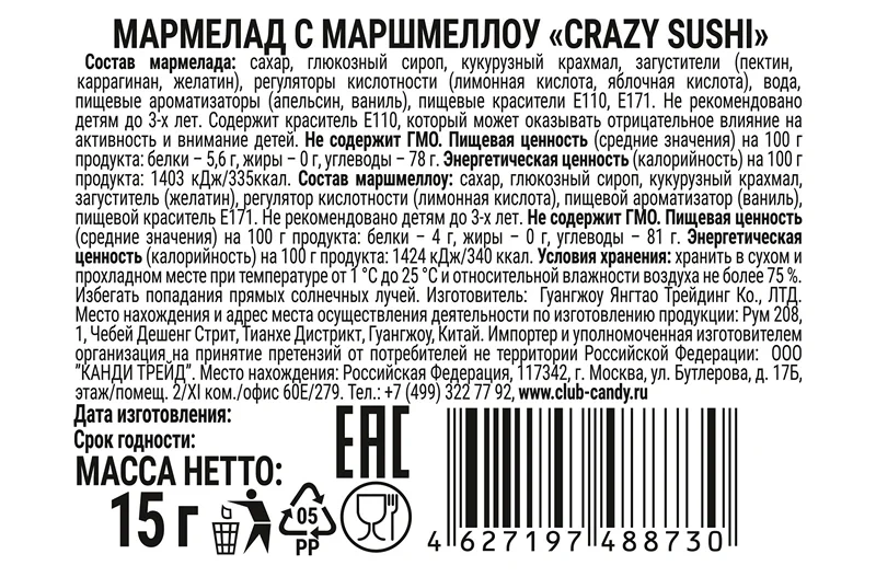 Мармелад Канди клаб Crazy Sushi с маршмеллоу, 15г x 20 шт