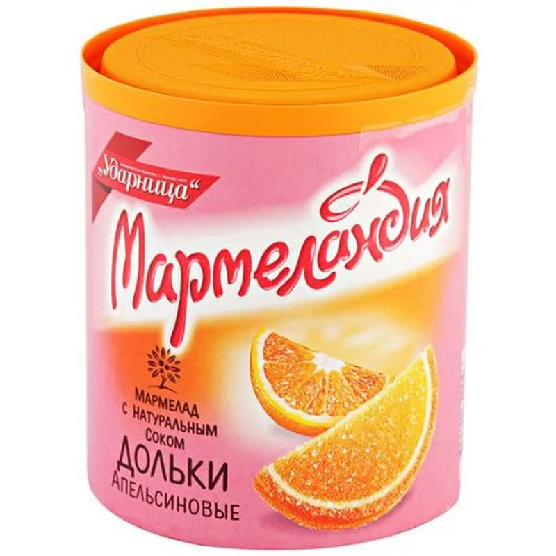 Знакомое с детства лакомство – аппетитные мармеладные дольки, посыпанные сахаром! Со вкусом и ароматом спелого апельсина они понравятся каждому, кто любит цитрусовые сладости. Дольки 'Мармеландия' от кондитерской фабрики 'Ударница' готовятся по обновленной, усовершенствованной технологии с добавлением натурального фруктового сока. Попробуйте! Состав: сахар, патока, желирующий агент – агар, сок апельсиновый, белок гороха, регуляторы кислотности – кислота лимонная, лактат натрия, цитрат натрия, экстракт апельсина, красители натуральные – кармин, куркумин.