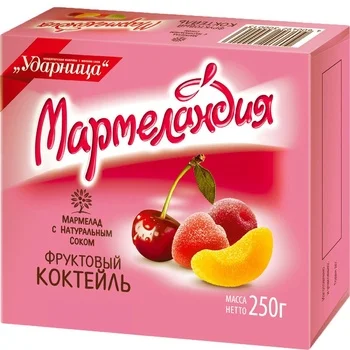 «Мармеландия» фруктовый коктейль — отличный спутник ежедневных чаепитий в кругу семьи или в кругу коллег по офису. Он займет достойное место среди любимых сладостей и прекрасно дополнит чайную или продуктовую корзину, предназначенную в качестве презента родным или друзьям.