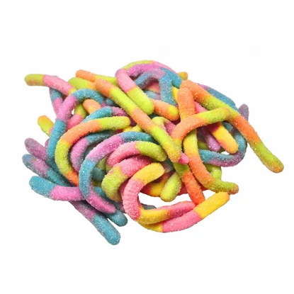 Жевательный желейный мармелад в форме мини-червей со вкусом ананаса, тутти-фрутти, яблока и малины.