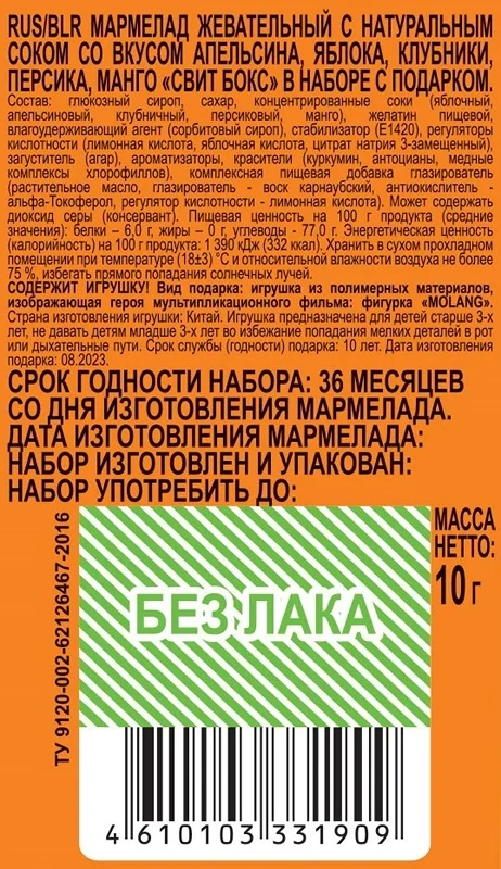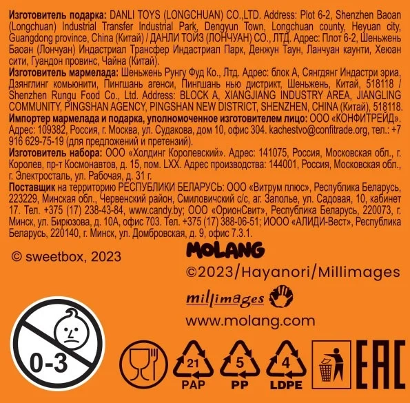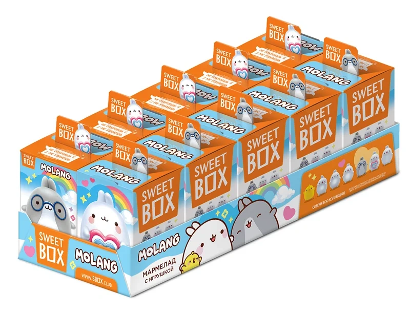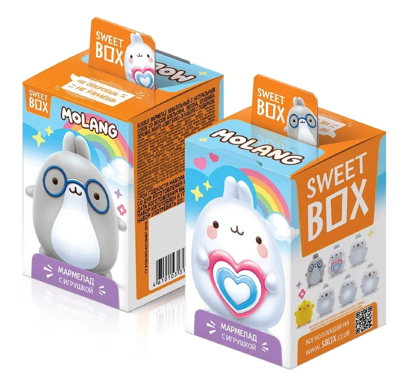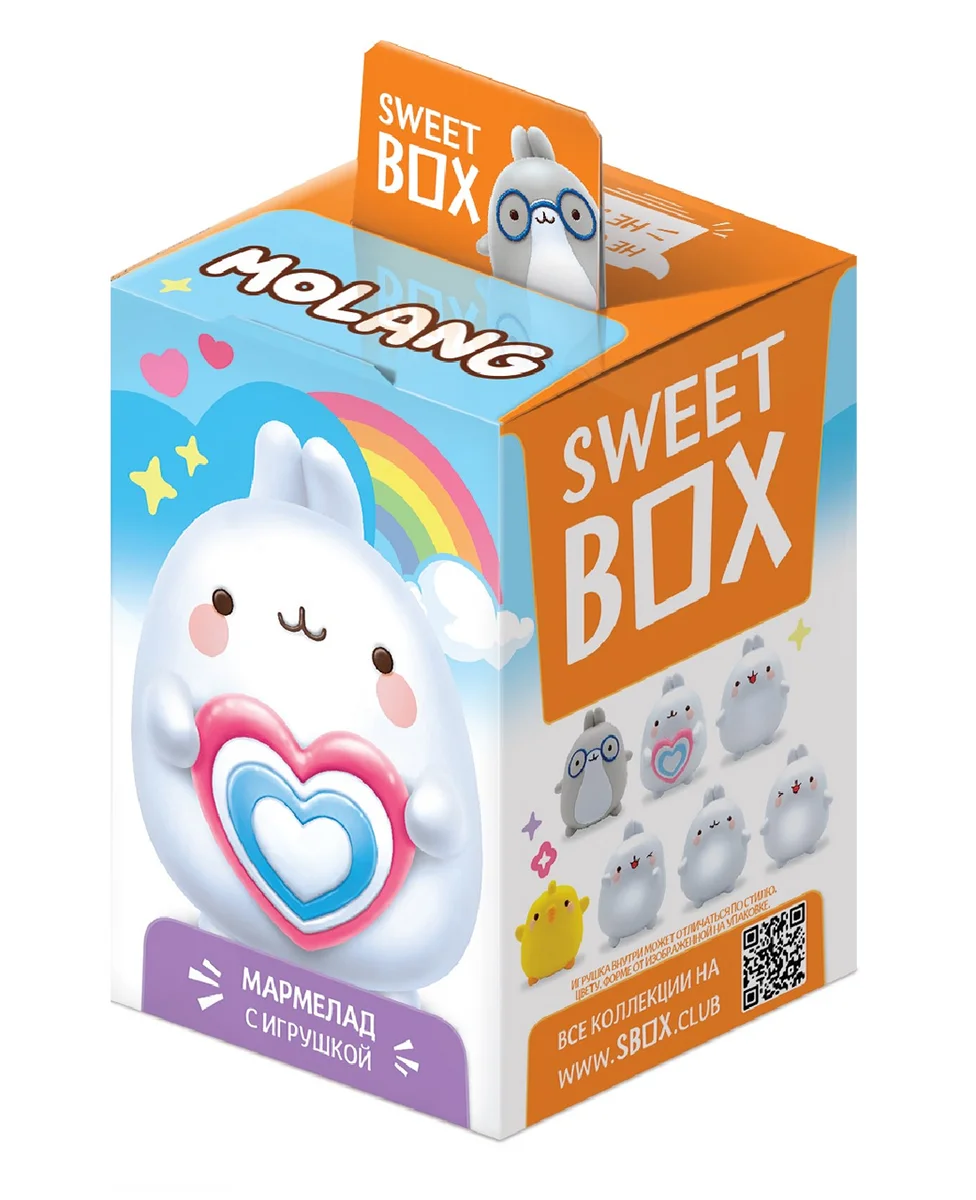 Коллекция Sweet Box Molang. В каждой коробочке вкусный мармелад с натуральным фруктовым соком подарок: игрушка, браслет. Это один из наиболее популярных и высококлассных продуктов торговой марки Конфитрейд. Представляет собой качественную коллекционную игрушку с самыми популярными героями. К игрушке идет коллекционный лифлет к каждому герою. Плюс сладкое вложение - это мармелад, пастилки или карамельки.