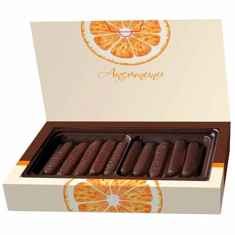 Апельсиновые палочки изготовлены на основе ценного природного вещества – агара, натурального сока и глазированы шоколадом высочайшего качества, очень вкусного и приятного. Не содержат красителей и искусственных Какао-продуктов в шоколаде не менее 56 %.