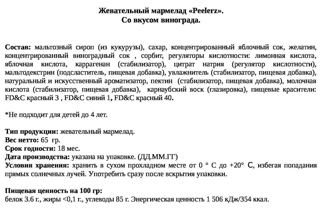Жевательный мармелад Peelerz выполнен в виде винограда. Необычность мармелада обусловлена тем, что фрукт содержится в кожуре, которую можно снять, при этом она является съедобной. Приготовлено на основе настоящего фруктового сока. Насладитесь подлинным вкусом фруктов, которые содержатся в наших мармеладах, благодаря мягкому, упругому внешнему слою и плотной сердцевине, обеспечивающей приятное послевкусие. Также отлично использовать мармелад, как перекус на работе, в школе и дома.