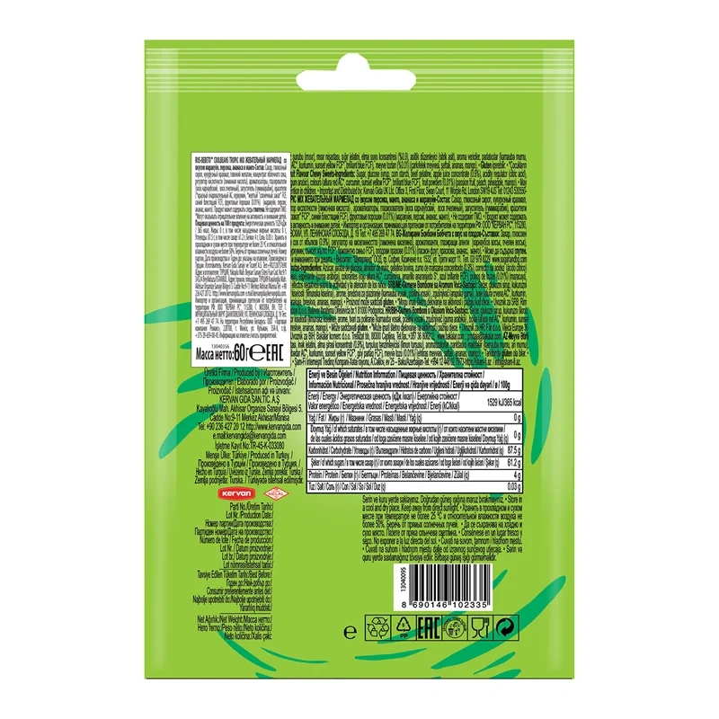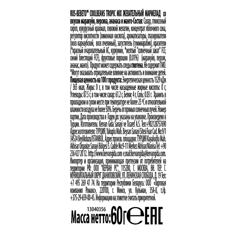 Жевательный мармелад в сахарной глазури со вкусом тропических фруктов. Каждое драже мармелада имеет один из пяти вкусов - персик; манго; ананас; кокос и маракуйя. Мармелад с cодержанием натурального сока.