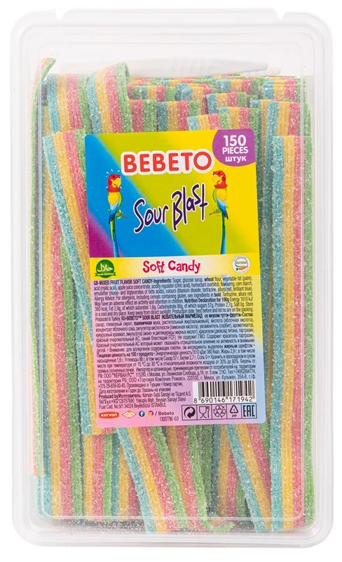 Кисло-сладкий жевательный мармелад с фруктовым вкусом в виде разноцветных ленточек. Удобный бокс с крышкой предотвращает высыхание продукта, а вложенные шицы позволяют доставать продукт из бокса. В каждом боксе 150 ленточек. Продукт не содержит продукции животного происхождения и пригоден для употребления вегетарианцами.