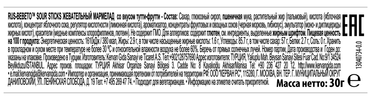 Жевательный мармелад со вкусом Тутти-Фрутти (фруктовое ассорти) на пластиковой подложке с легкой кислинкой. Продукт не содержит ингредиентов животного происхождения, что делает его пригодным для употребления вегетарианцами.