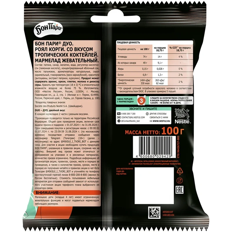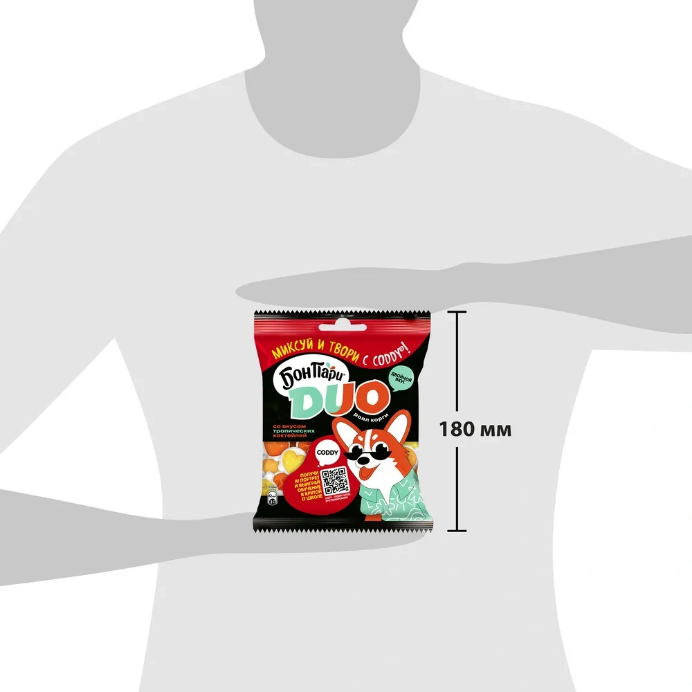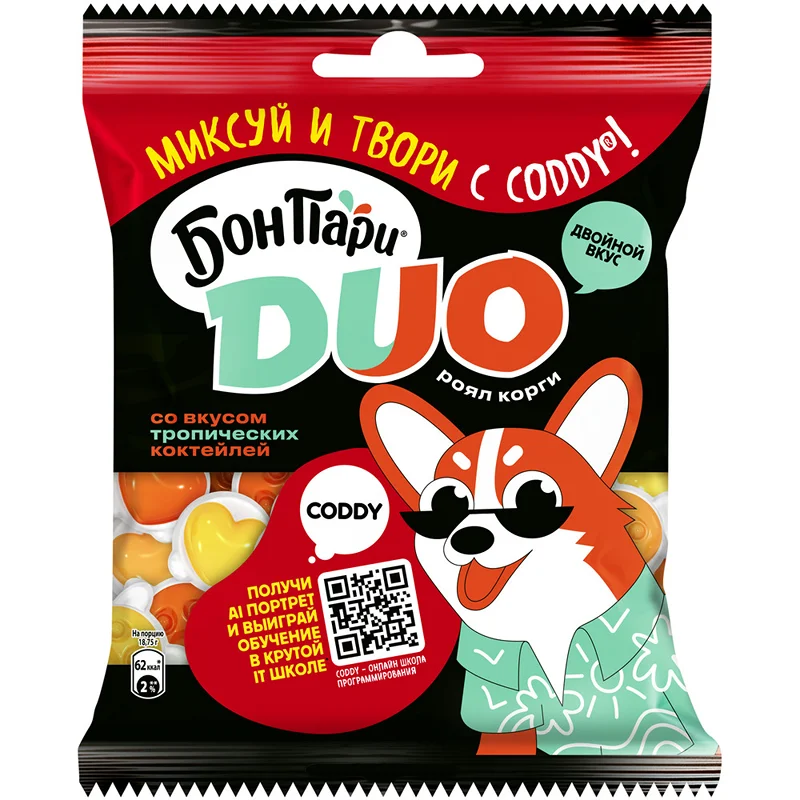 Жевательный мармелад Бон Пари Дуо в форме собачек корги. Мармелад Бон Пари Дуо для тех, в ком жив внутренний ребенок: сладкая жевательная провокация в форме смешных корги: обаятельные мордочки и сердечки со вкусом тропических коктейлей: манго-кокос, лимон-кокос, апельсин-кокос, клубника-кокос. Замиксуй по-королевски, соедини две мармеладные половинки и получишь тропическую собачку-вкусняшку. Упаковку удобно взять с собой или разделить с друзьями. Cледите за рекомендуемой порцией сладкого. Одна порция: две дуо-мармеладки. Мармелад производится без добавления искусственных красителей. В производстве используется концентрированный фруктовый сок. Необычное сочетание кислого и сладкого. Без искусственных красителей.