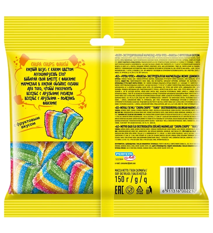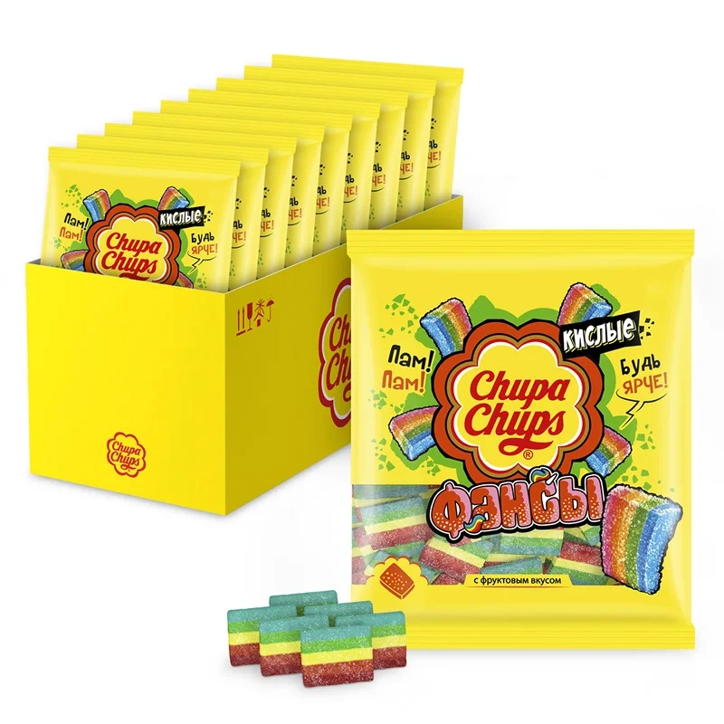 Мармелад Chupa Chups Кислые фансы, 150 г – вкусное лакомство для взрослых и детей. В состав десерта входят компоненты, которые делают его вкус действительно напоминающим настоящие фрукты. Его отлично дополняет яркая кислинка. Такие конфеты смогут послужить отличным украшением для торта, пирожных и других десертов. Их можно взять с собой на прогулку в качестве легкого перекуса или съесть за просмотром фильма вечером дома. Конфеты и мармелад – неотъемлемая часть подарка на Новый год. Им обрадуются взрослые и маленькие сладкоежки. К тому же это отличная альтернатива калорийным пирожным и тортам и хорошая идея для похода в гости.