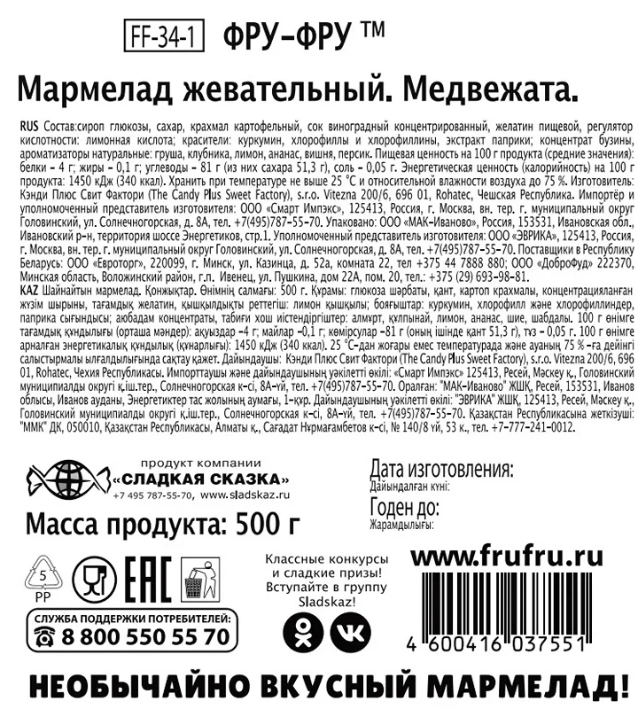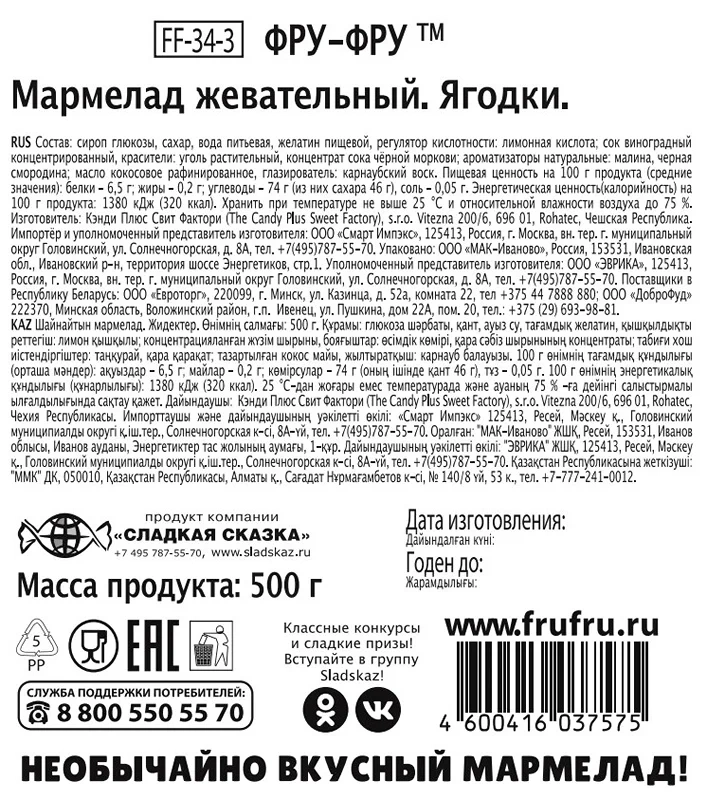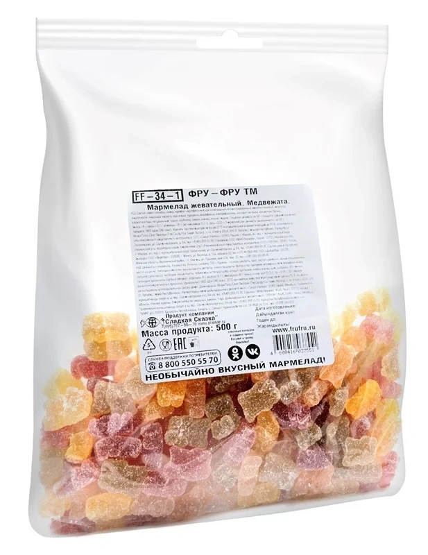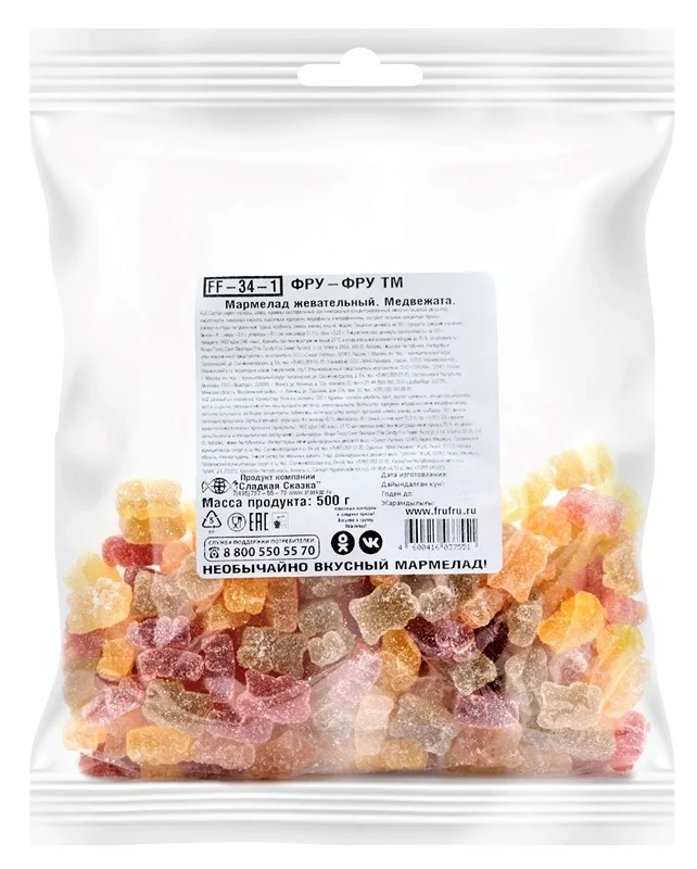 Жевательный мармелад Фру-Фру представлен в пакетах весом 0,5 кг. Он позволяет надолго запастись любимым лакомством и попробовать его различные виды в любом количестве.