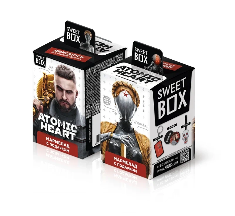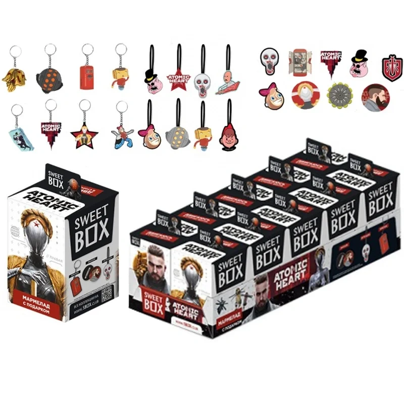 Коллекция Sweet Box Atomic Heart по мотивам популярной компьютерной игры. В каждой коробочке вкусный мармелад с натуральным фруктовым соком и аксессуары: брелок, значок и пуллер. Всего в коллекции 24 подарка.