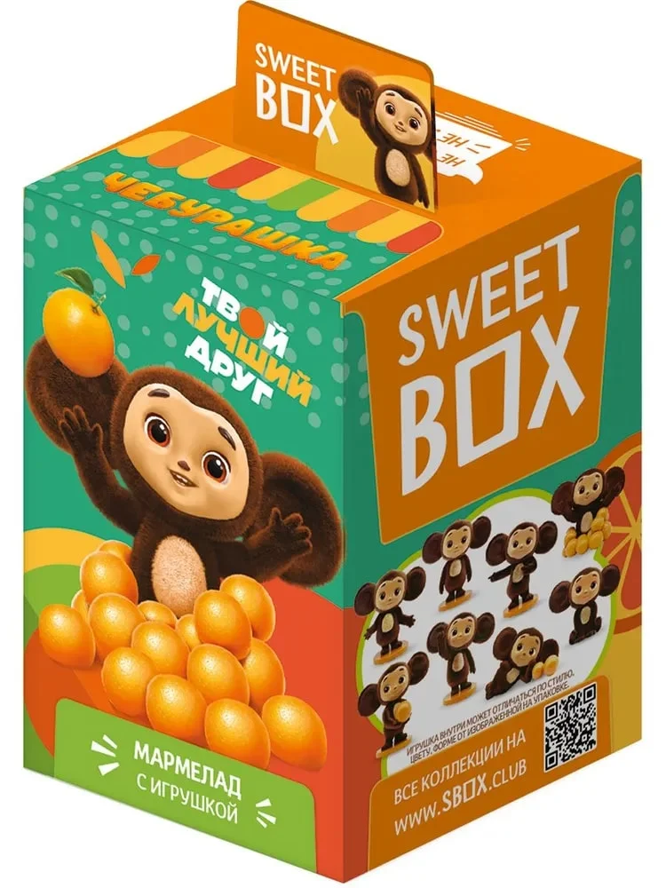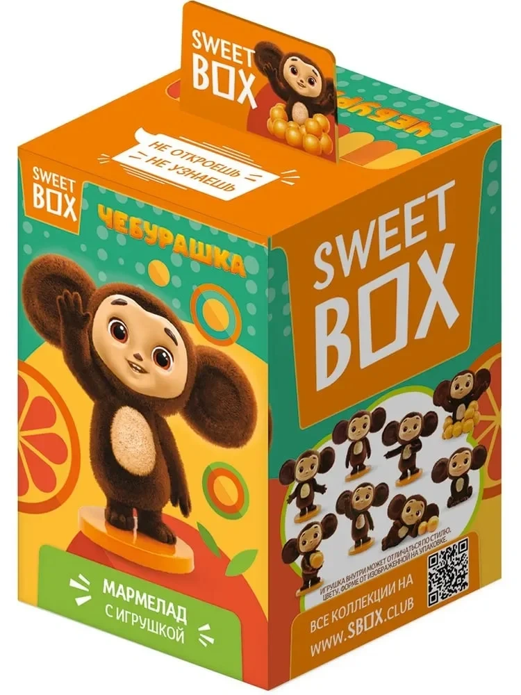 Коллекция Sweet Box по мотивам фильма Чебурашка. В каждой коробочке вкусный мармелад с натуральным фруктовым соком, лифлет с описанием персонажа и 3Д игрушка.