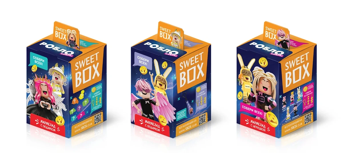 Roblox - популярная метавселенная, онлайн-игра, где пользователи общаются в виртуальном мире. Роблоксеры - популярные блогеры, создавшие своих аватаров на этой платформе. Персонажи игровой платформы мегапопулярны среди детей и подростков. В коробочках Sweet box вкусный мармелад с натуральным соком и приятный подарок: игрушка или аксессуары. Более 25 подарков в коллекции.