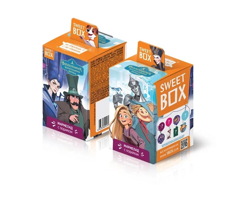 Коллекция Sweet Box Волшебник Изумрудного города к премьере нового мультфильма. Внутри коробочки вкусный фруктовый мармеладом с натуральным соком и коллекционными подарками: брелоком, значком, пуллером или браслетом с двумя насадками. Более 25 подарков в коллекции.