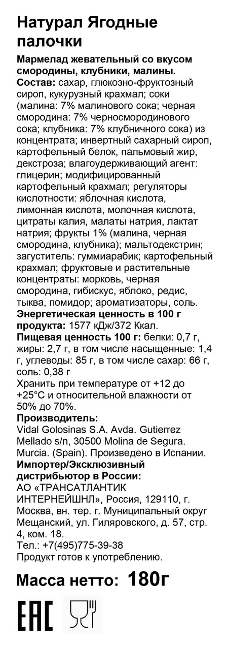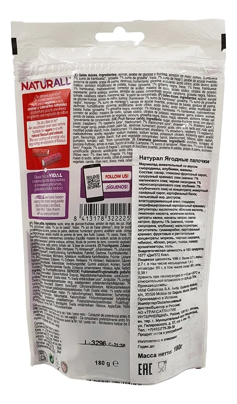 Мармелад жевательный Vidal Naturall Ягодные палочки, 180г