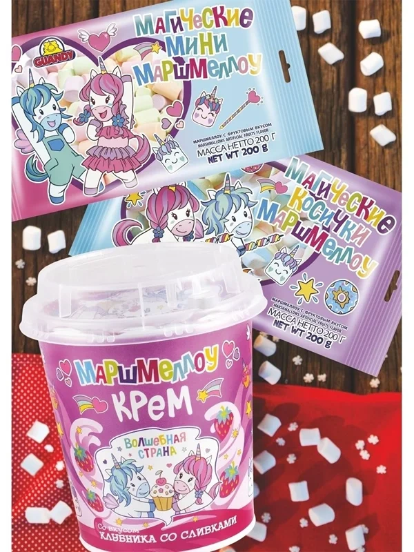 Волшебная страна — это новый бренд детских сладостей в одном из самых популярных дизайнов по результатам опросов целевой группы. Маршмеллоу Волшебная страна — сложный и уникальный продукт, имеющий особую закрытую технологию производства, которая включает в себя рецептуру и опыт в данной отрасли на протяжении более 35 лет. Не каждый производитель маршмеллоу способен повторить особую температурную формулу, а ведь именно она позволяет нам использовать маршмеллоу множеством разных интересных и вкусных способов, а также придает ему идеальную упругость и нежный ванильный вкус. Кроме того, наш маршмеллоу не содержит жир, глютен, лактозу и яичный белок. Производство нашего маршмеллоу находится в Гватемале и соответствует всем высочайшим стандартам мирового качества. Кроме того, технология и рецептура нашего маршмеллоу разработана специально для России, учитывает наши климатические особенности и соблюдает все требования к такому нежному продукту! Поэтому именно наш маршмеллоу идеально жарится на огне и плавится при тепловой обработке, максимально долго сохраняет свою мягкость и упругость даже после вскрытия упаковки, а также создает самую стойкую и нежную ванильную пенку при использовании в напитках.