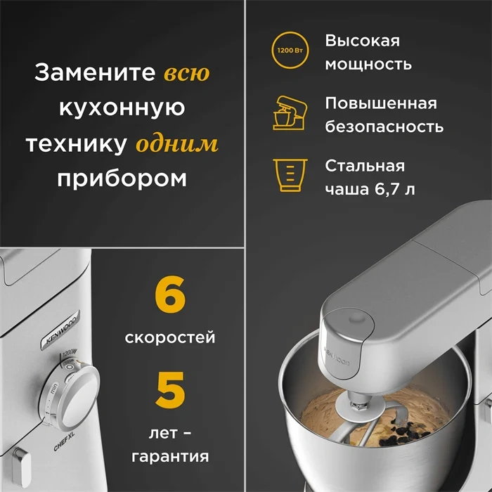 Кухонная машина Kenwood KVL4100S обладает мощностью 1200Вт, значительно ускоряющей приготовление пищи. Металлическая чаша объемом 6.7 л не изменяет вкусовых качеств продуктов, так как не вступает с ними в реакцию. Корпус выполнен из металла, что делает его прочным и ударостойким. Основной цвет – серебристый. Kenwood KVL4100S оснащена восемью скоростями работы, которые можно выбирать для производства того или иного блюда. Прибор оснащен импульсным режимом, защитой от перегрузок, регулированием скорости. К дополнительным опциям относятся плавный запуск двигателя, плавная регулировка скорости, защита от перегрева, защита от брызг, планетарное вращение, К-образная насадка для смешивания. Работа кухонной машины осуществляется через подключение к сети. В комплект входит насадка для теста и венчик для взбивания, весы и таймер не предусмотрены.