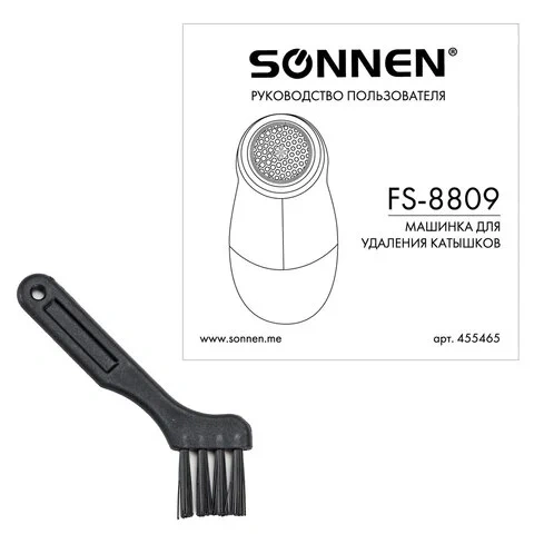 Миниклинер SONNEN FS-8809 бело-голубого цвета сделан из ABS пластика, а лезвия и сетка из нержавеющей стали. Питается прибор от двух AA батареек 1.5V каждая (НЕ В КОМПЛЕКТЕ!). Диаметр рабочей поверхности – 41 мм. Переключатель ON/OFF находится на левой стороне корпуса - удобно держать и переключать одной рукой. Миниклинер оснащен съемным резервуаром для срезанных катышков. Комфортно лежит в руке.