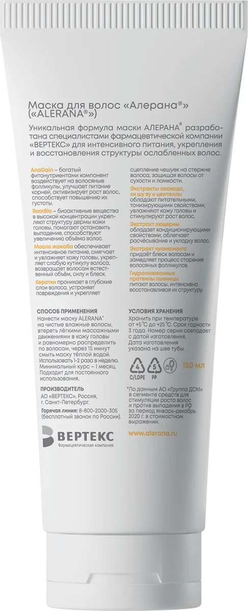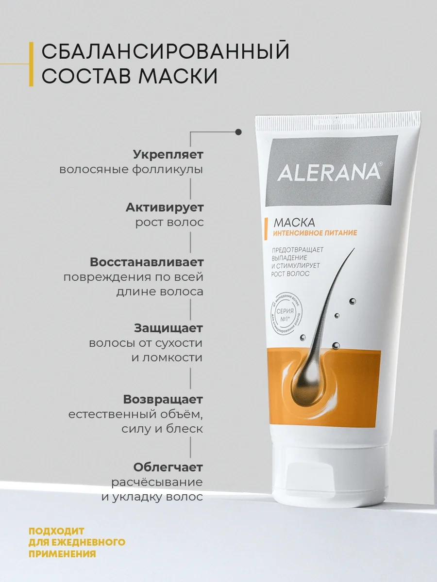 Маска для интенсивного питания оздоравливает волосяные фолликулы и восстанавливает поврежденные волосы по всей длине. Кератин, экстракт люцерны и гидролизованные протеины в составе маски защищают от ломкости, укрепляют стержень волоса и облегчают расчесывание. Маска содержит растительные стимуляторы роста волос AnaGain и Rootbio с доказанной эффективностью действия. AnaGain и RootBio, воздействуют на волосяные фолликулы, улучшают питание корней, активизируют рост волос. Коэффициент роста волос +78%. Уменьшение потери волос на 31%; клеточный метаболизм и помогает ускорить рост волос за счет перехода фолликулов в активную фазу. Ценный состав маски действует в двух направлениях, поэтому наносить маску следует и на волосы, и на кожу головы. Результат: интенсивный питательный уход делает волосы прочными и сильными, восстанавливая их структуру от корней до кончиков.