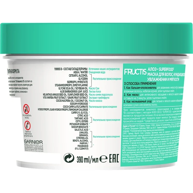 Маска для волос Garnier Fructis Superfood Алоэ 3в1 для волос нуждающихся в увлажнении и мягкости, 39