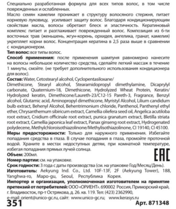 Уникальная маска для волос Kerasys основана на научных исследованиях и формуле восточной красоты. Одним из главных преимуществ этой маски является ее высокая концентрация кератина, которая в 2,5 раза превышает содержание этого полезного вещества в обычном кондиционере. Благодаря этому, маска обеспечивает интенсивное питание и восстановление волос, делая их сильными, блестящими и эластичными. Она защищает волосы от негативного воздействия ультрафиолета, предотвращая их повреждение и выцветание. Одним из ключевых компонентов маски является масло камелии, которое укрепляет хрупкие и ломкие волосы, делает их шелковистыми по всей длине. Маска также содержит композицию из шести традиционных восточных трав, таких как женьшень, жгун-корень, орхидея, ангелика, гранат и листья камелии. Они укрепляют луковицы волос и предотвращают их преждевременное выпадение. Эта маска идеально подходит для всех типов волос, включая поврежденные и ослабленные. Лечение и восстановление волос всех типов, укрепление их структуры, стимуляция их роста, защита от агрессивных внешних воздействий и высоких температур при укладке, придача локонам упругости, блеска и шелковистости, предотвращение появления секущихся кончиков - все это становится возможным с маской для волос от южнокорейской компании Kerasys.Формула Oriental Premium Treatment содержит:- масло камелии, которое способствует активизации волосяных луковиц, придает здоровье волосам, укрепляет локоны, способствует их росту, возвращают блеск, хорошо питая их;- экстракт дягиля, что увлажняет и тонизирует кожу головы, стимулирует рост волос, обладает противовоспалительными и питательными свойствами.