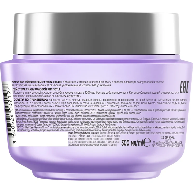 Маска для волос L'oreal Elseve Гиалурон наполнитель Увлажняющая, 300мл