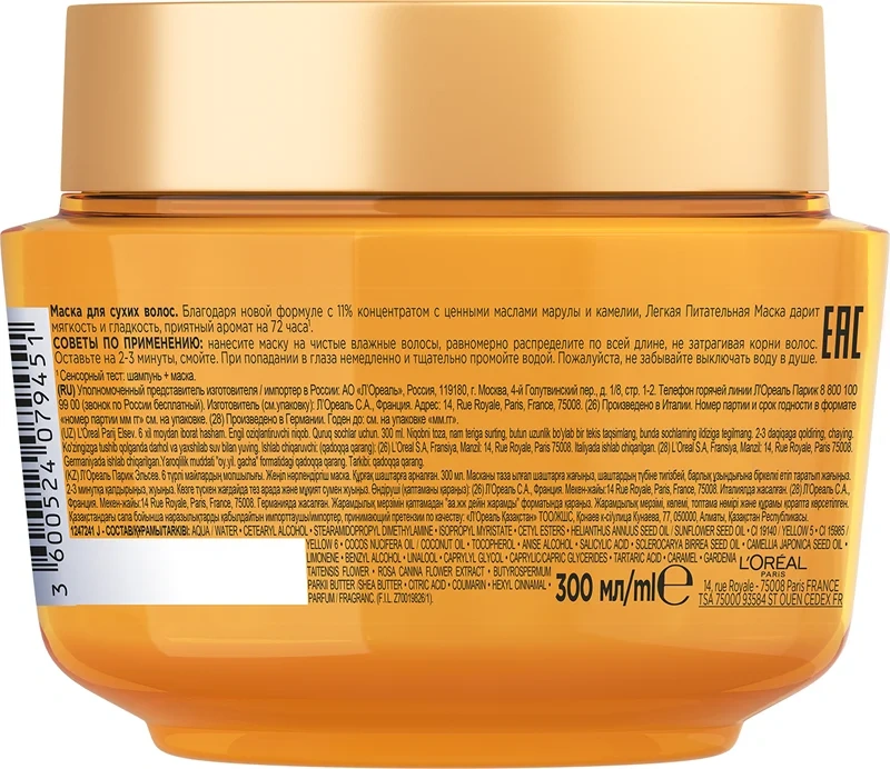 Благодаря своей роскошной тающей текстуре и формуле, обогащенной 10% концентратом с ценными микромаслами марулы и камелии, маска интенсивно питает волосы по всей длине без утяжеления. +90% питания. Обеспечивает идеальный уход за волосами разных типов. Обеспечивается интенсивное увлажнение и питание, локоны приобретают силу и здоровый внешний вид. Они становятся шелковистыми и блестящими. Легкая консистенция продукта не утяжеляет пряди и не делает их жирными. Наоборот, волосы становятся более послушными, их легче расчесывать.