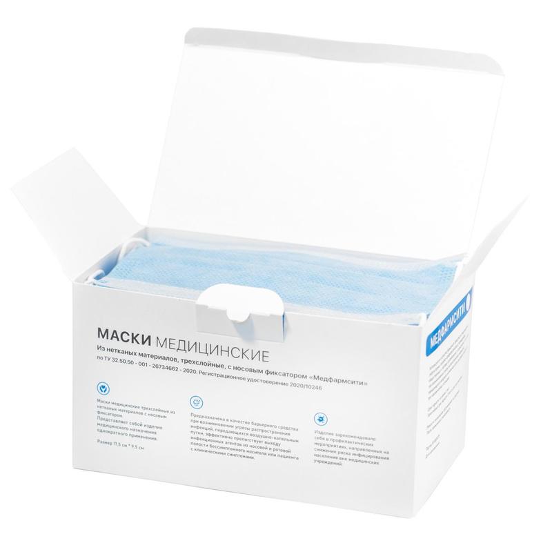 Маска защитная медицинская 3-слойная голубая, Премиум, 50шт, нетканый материал