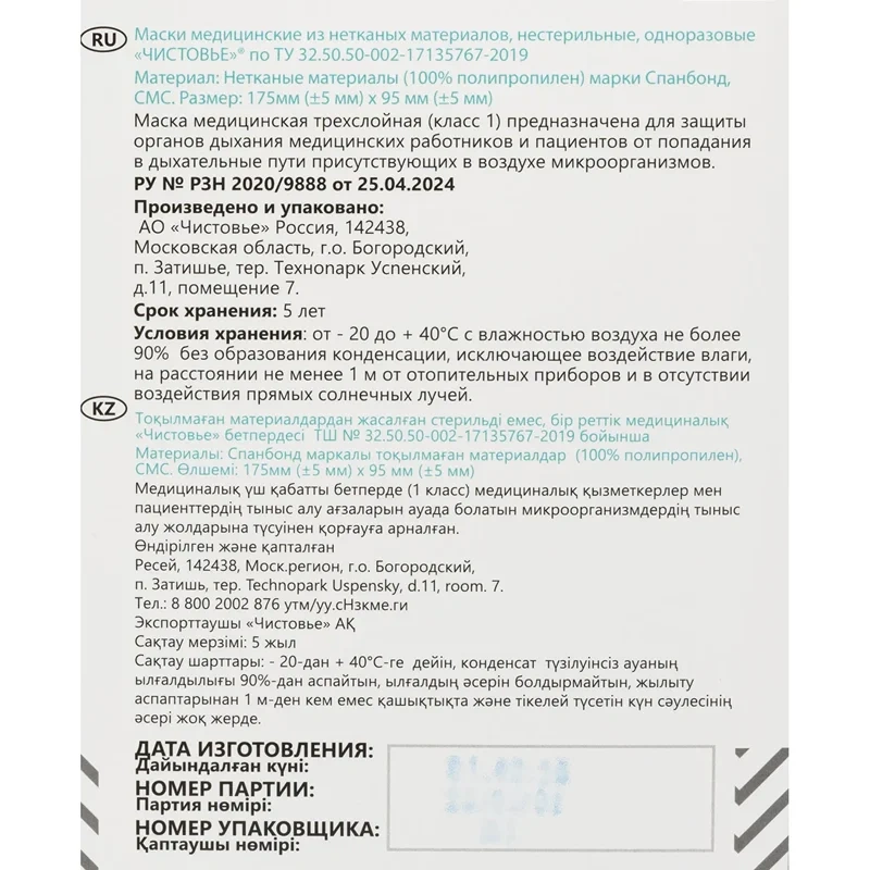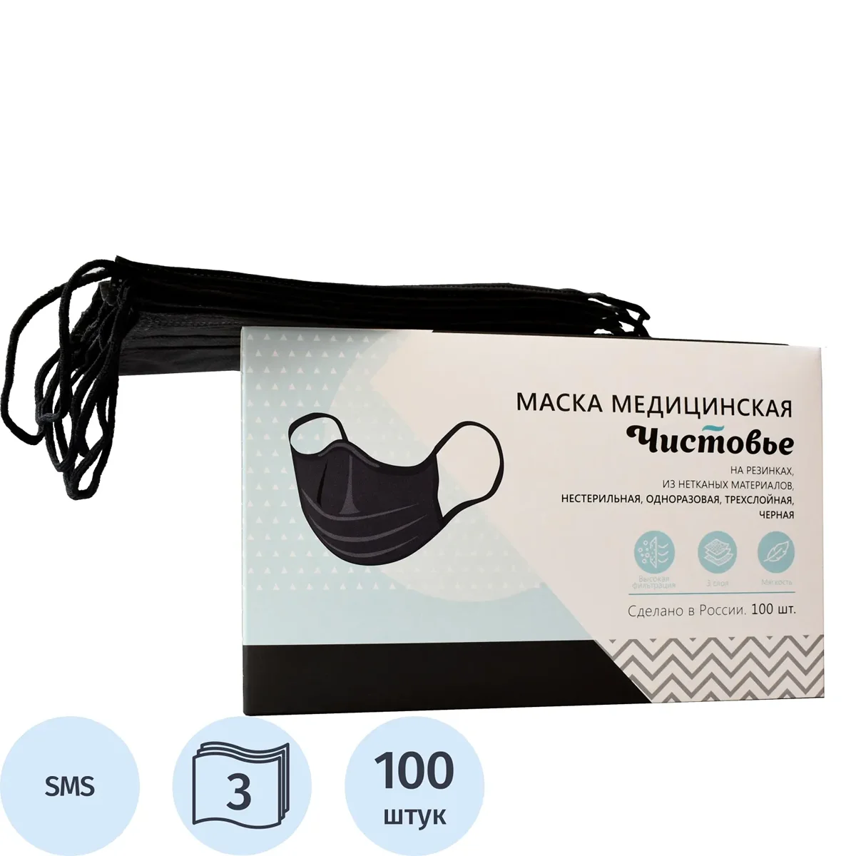 Медицинские маски предназначены для защиты органов дыхания от попадания в дыхательные пути микроорганизмов, присутствующих в воздухе. Маски состоят из трёх слоёв: первый и третий слои изготовлены из спанбонда, а средний фильтрующий слой — из материала SMS, что обеспечивает высокий уровень фильтрации. Маска размером 17.5×9.5 см не препятствует свободному дыханию, обеспечивая комфортное ношение. Изделие имеет РЗН № 2020/9888 от 18.02.2021 года. Маски упакованы в картонную коробку по 100 штук и произведены в России.